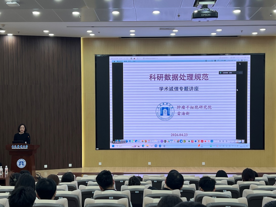为深入贯彻落实学校关于师德师风建设和科研诚信建设的相关要求,切实筑牢师生学术道德防线,营造严谨求实的学术生态,4月23日,肿瘤干细胞研究院、医学科学研究院、实验动物中心联合举办“科研数据处理规范”专题讲座。本次讲座邀请肿瘤干细胞研究院雷海新教授主讲,三个单位近200名师生参加。讲座由肿瘤干细胞研究院、医学科学研究院党总支书记韩静主持。